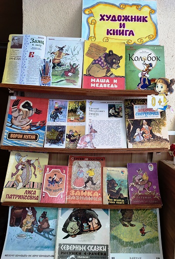 На книжно-иллюстративной выставке, посвящённой творчеству Евгения Рачёва, представлены книги, проиллюстрированные мастером из фонда районной детской библиотеки-филиала.